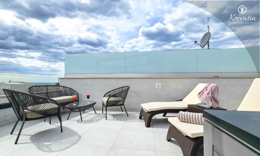 Al piano terra si trova un ampio soggiorno collegato alla sala da pranzo e alla cucina, attrezzata con tutto il necessario per preparare i pasti, e un bagno con doccia e WC. Al primo piano ci sono due camere da letto con letti matrimoniali e balcone, un ulteriore bagno e altre due persone possono dormire comodamente nel soggiorno. Sulla terrazza sul tetto si trovano una vasca idromassaggio e mobili da giardino, mentre al piano terra c'è un'ampia terrazza per rilassarsi con barbecue.