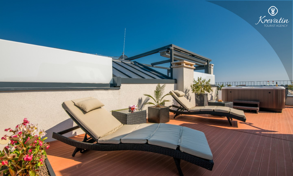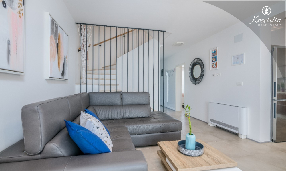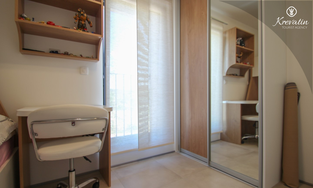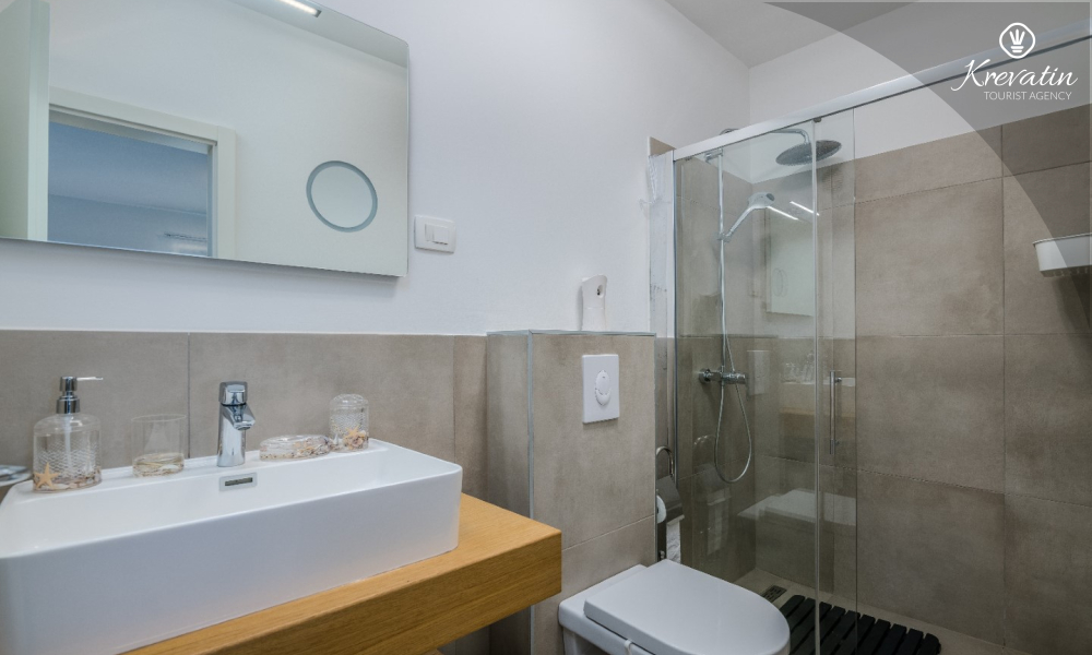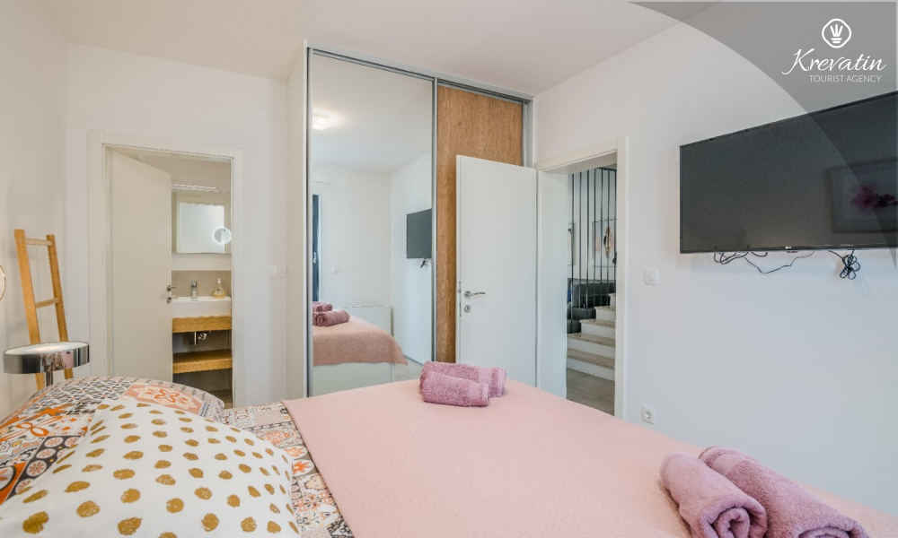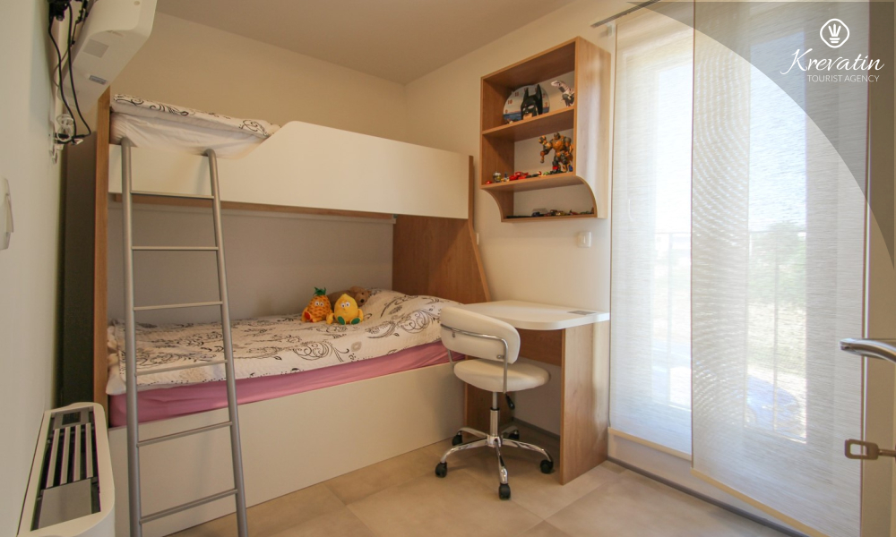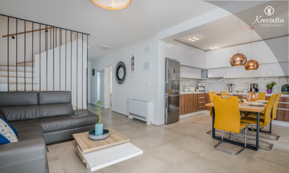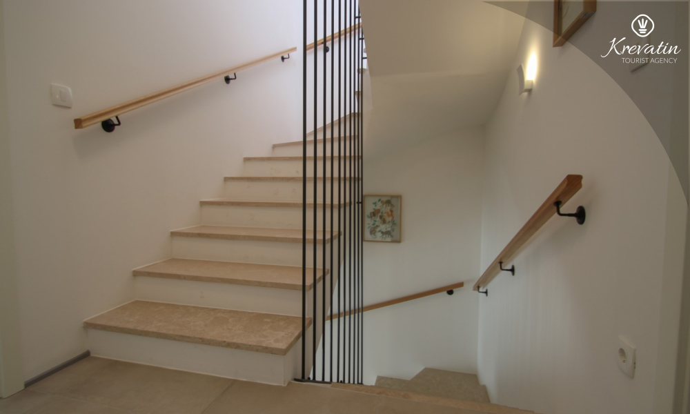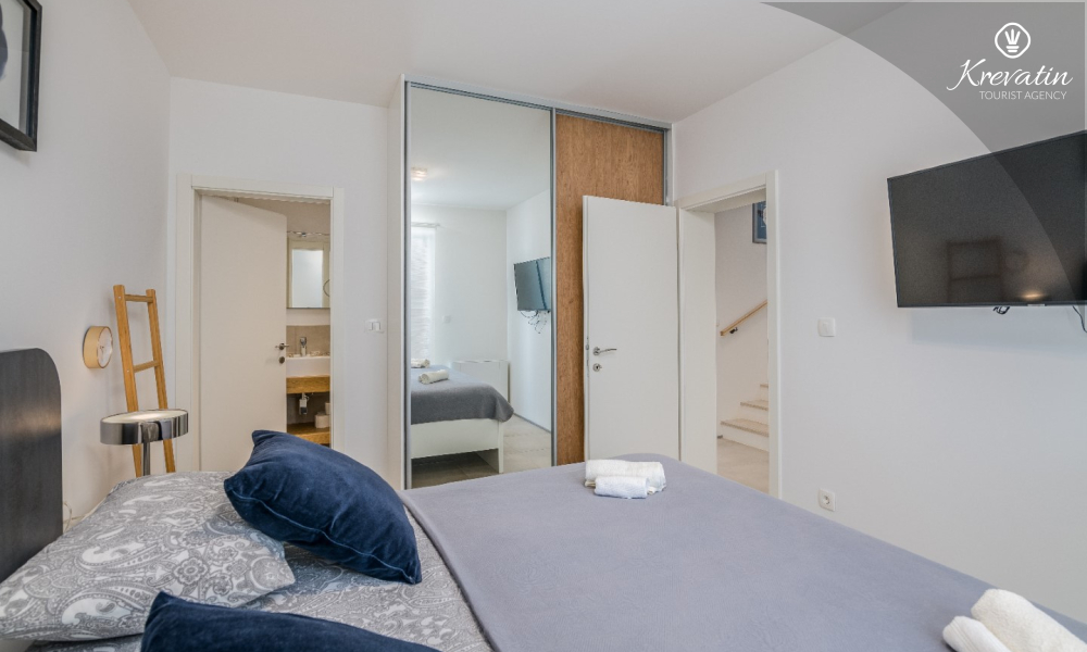 Al primo piano si trovano altre due camere da letto: una con letto matrimoniale e bagno privato, e l'altra con un letto a castello. Inoltre, al primo piano si trovano una seconda cucina e un bagno con vasca, mentre sulla terrazza panoramica si trovano una vasca idromassaggio e lettini prendisole, per un comfort e una comodità aggiuntivi.