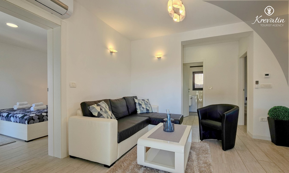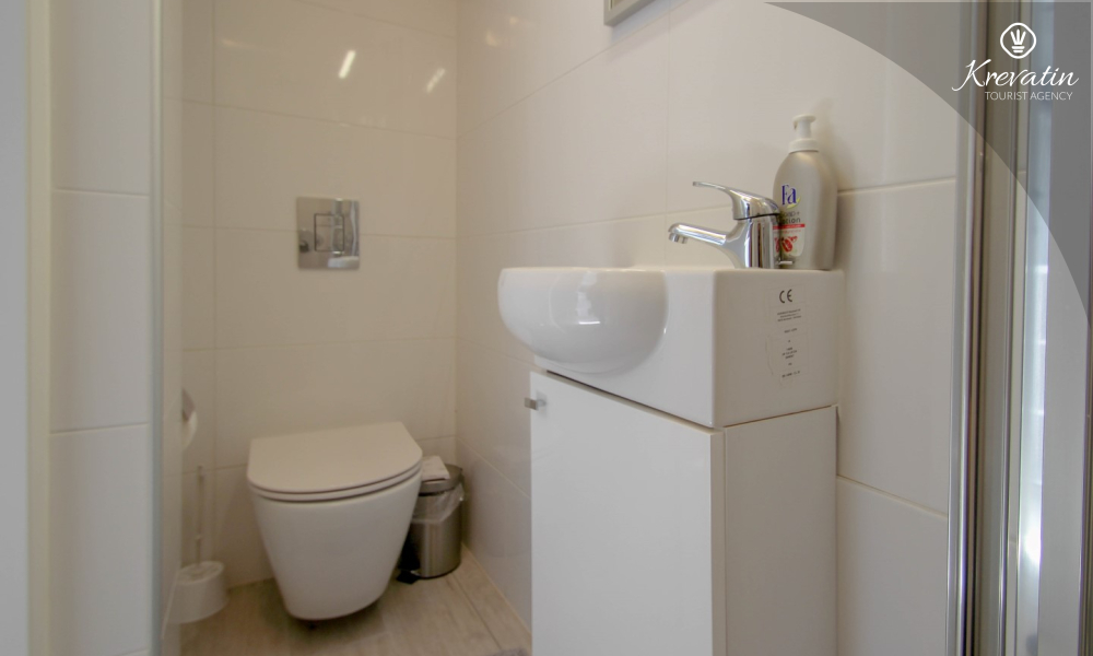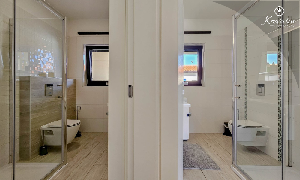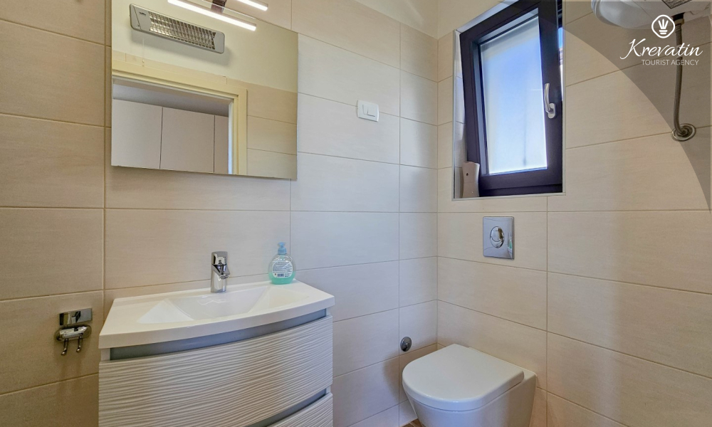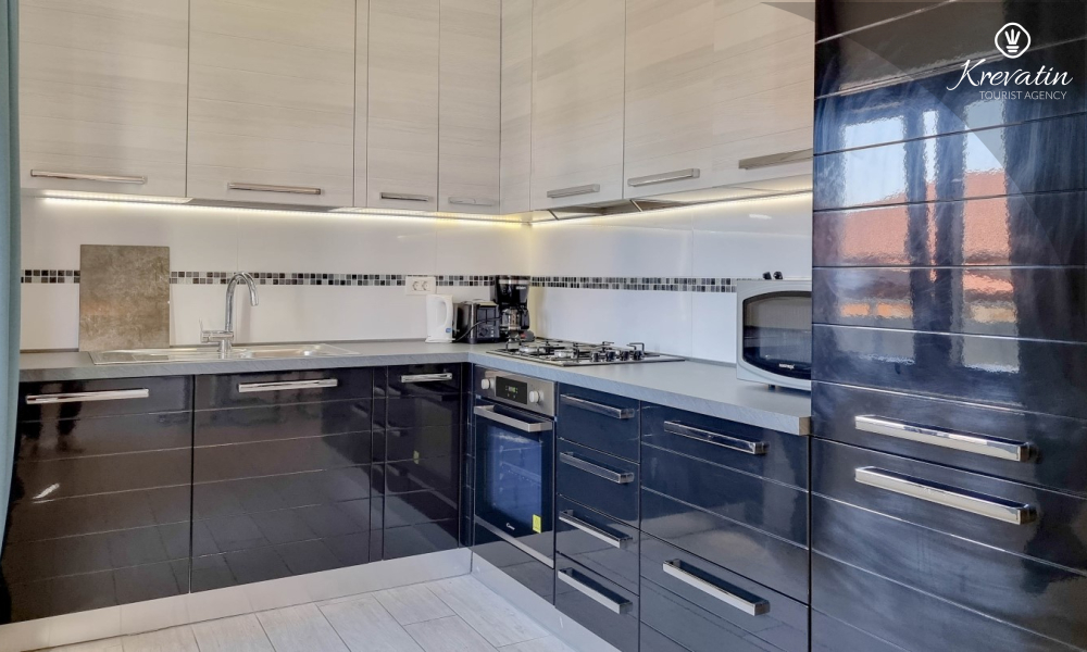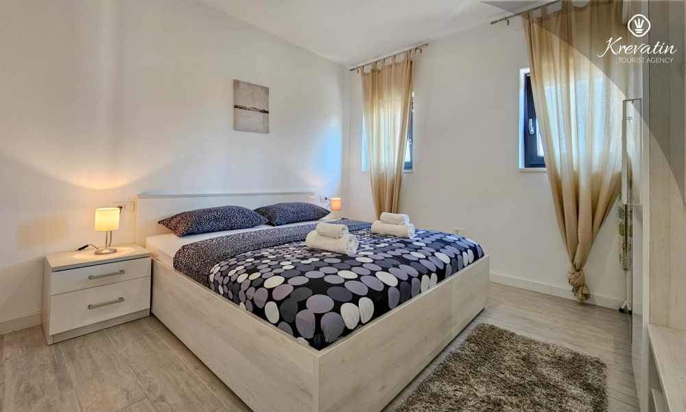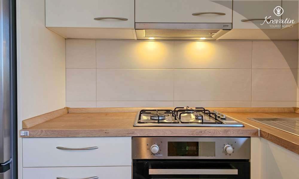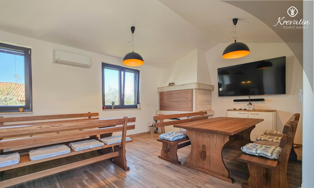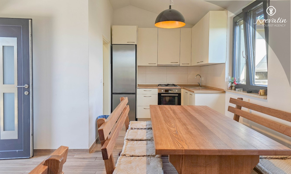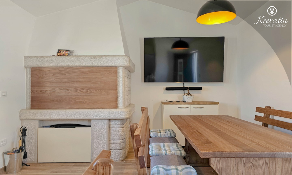 Questa casa vacanze da 8 a 10 persone è composta da tre unità, tutte situate al piano terra. Innanzitutto c'è un grande appartamento con tre camere da letto e un divano letto per due persone, due bagni e un soggiorno con cucina. La cucina è dotata di fornello a gas, frigorifero, lavastoviglie e macchina per il caffè. Secondo, c'è un monolocale per due persone con un letto matrimoniale, un bagno e una piccola cucina. E terzo, c'è una taverna con cucina attrezzata, un grande camino interno e un bagno.